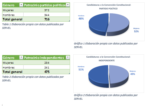 En consecuencia, se puede observar; tanto en las tablas 1 y 2 y en los gráficos 1 y 2, que dentro de las candidaturas patrocinadas por los partidos políticos como por independientes, que se ha roto la barrera del 30 % que hubo en 2017, pasando inclusive a más mujeres como candidatas en algunos distritos que los hombres, lo que implica un salto significativo en la consolidación de los derechos políticos femeninos en nuestro país.