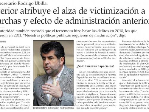 El pasado 18 de enero el subsecretario de Interior, Rodrigo Ubilla, sorprendió a todos con sus declaraciones al diario El Mercurio donde atribuyó el aumento de la victimización revelado por la última encuesta de Paz Ciudadana de diciembre de 2011, al desvío de personal policial como consecuencia de las marchas y a lo que llamó “efecto residual” de la administración anterior. En la nota, el Subsecretario Ubilla se refiere a múltiples consideraciones sobre la distribución de Carabineros, que solo se explican si él estaba en conocimiento de esos informes policiales que le permitían hacer tamañas afirmaciones de relación causa-efecto entre marchas y victimización y explica la baja en la victimización del año 2010 al terremoto.