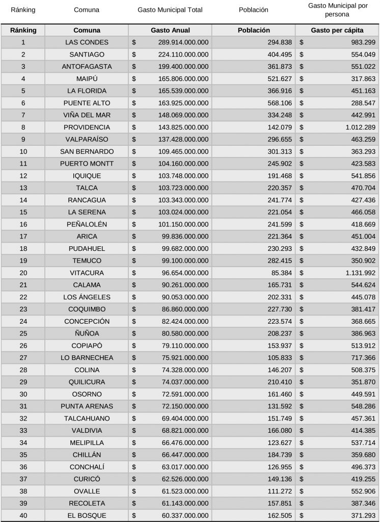 La siguiente tabla busca exponer, precisamente, cuál es la capacidad de gasto de las 39 municipalidades que anteceden a Recoleta en materia presupuestaria. Usted verá si siente que su presupuesto comunal está bien gastado o no, o, mejor aún, si le gustaría ser parte de su confección.
