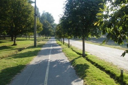 Un ciclista, un niño y bicicletas por la vereda