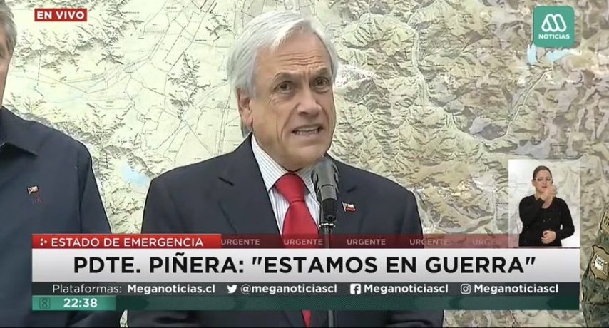 El Presidente ha declarado ante la prensa y toda la nación, que el país se encuentra en guerra con un enemigo peligroso. No existe en Chile una guerrilla ideológica armada. No existe tampoco una facción del ejército en sublevación. No existe tampoco una invasión bélica extranjera. ¿Entonces cuál es el fundamento del Presidente para entablar declaraciones semejantes? Sólo infundir temor, inseguridad e incentivar el odio caótico. Esas declaraciones no ayudan a detener las actividades delectivas del lumpen oportunista, por el contrario, las potencian.