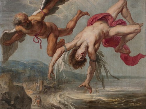 En la mitología griega Ícaro y su padre Dédalo deciden escapar de la isla de Creta. Enlazaron plumas entre sí, uniendo con hilo las plumas centrales y con cera las laterales, dándole al conjunto la suave curvatura de las alas de un pájaro. Conocido por todos su desenlace, Ícaro al volar muy cerca del sol ablandó la cera que mantenía unidas las plumas y estas se despegaron. Ícaro agitó sus brazos, pero no quedaban suficientes plumas para sostenerlo en el aire y cayó al mar.